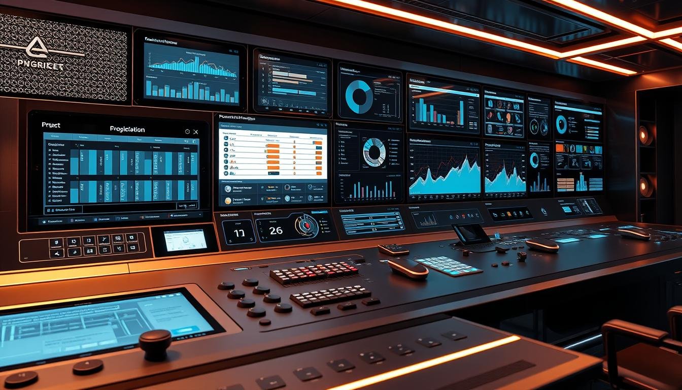 An elegant and modern office interior, filled with smart project management tools and technologies. In the foreground, a sleek, high-resolution digital dashboard displays key metrics and timelines for various projects. The middle ground features a team of professionals collaborating around a large touchscreen table, using intuitive interfaces to coordinate tasks and deadlines. In the background, floor-to-ceiling windows offer a panoramic view of a vibrant cityscape, bathed in warm, natural light. The overall atmosphere is one of efficiency, innovation, and seamless collaboration, reflecting the advanced capabilities of Nutshell.com's project management platform.