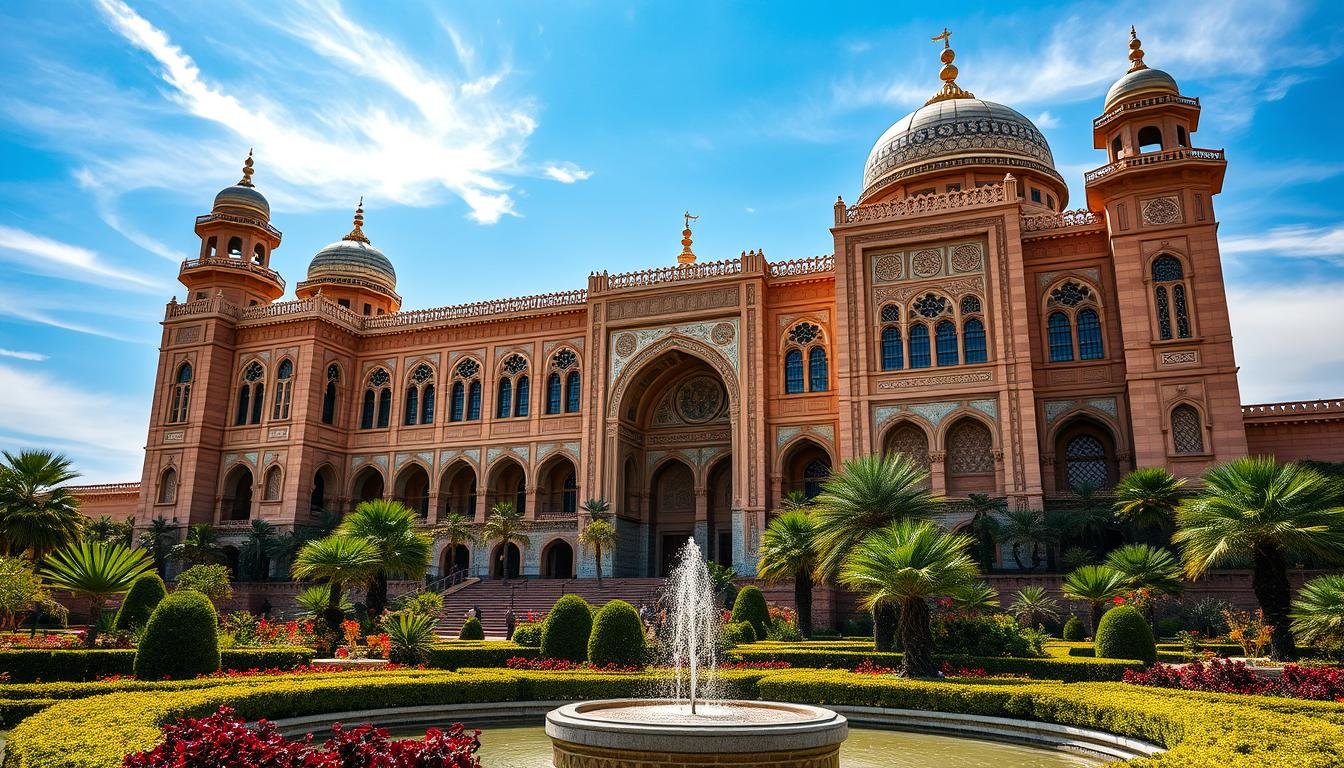 A grand, stately building with elegant Arabic architectural features, set against a backdrop of a vibrant blue sky. Sunlight streams through ornate windows, casting warm, golden illumination on the intricate facade. The structure conveys a sense of majesty and purpose, symbolizing the noble intentions and strategic objectives of the Zayed Foundation. Lush greenery and calming water features surround the building, creating a serene, contemplative atmosphere. The composition balances grandeur and tranquility, reflecting the Foundation's commitment to humanitarian aid and charitable works in the UAE.