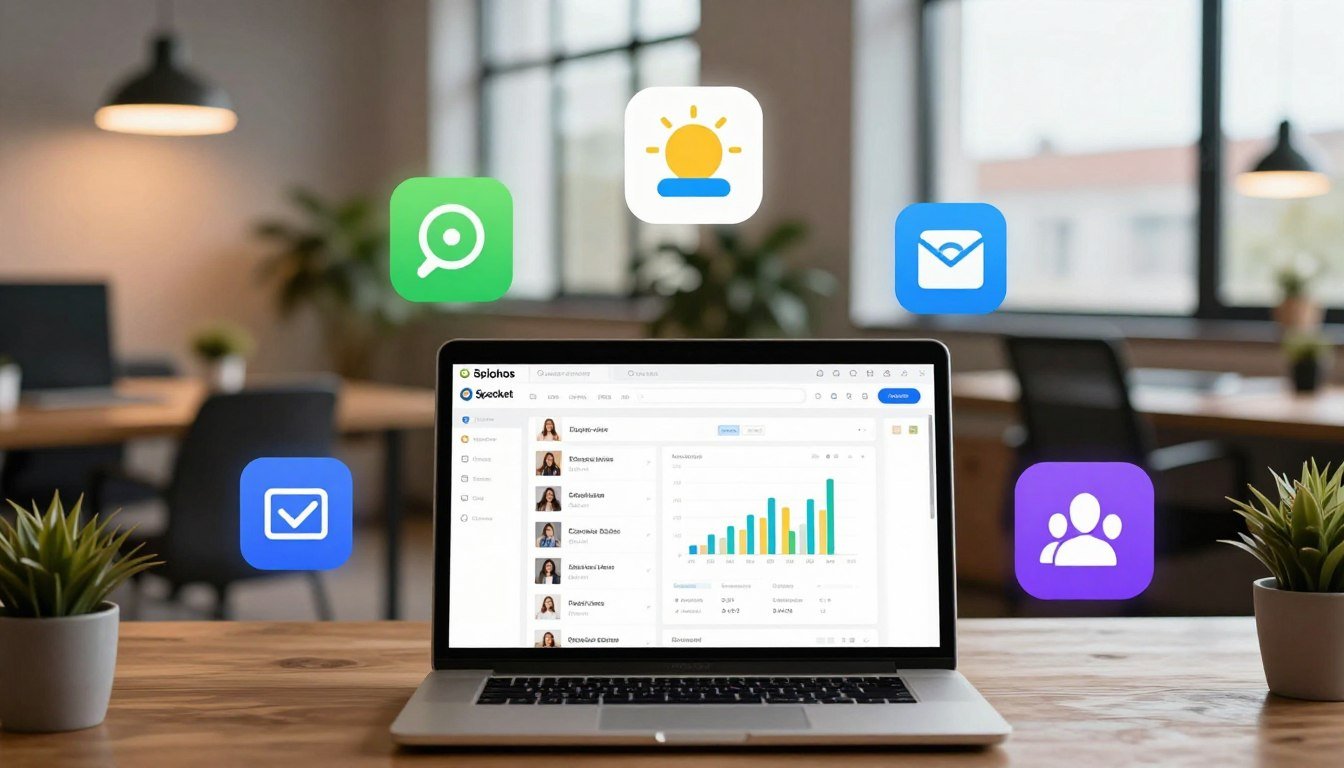 A modern workspace illustrating the key features and tools of the Spocket dropshipping platform. In the foreground, a laptop displays an intuitive dashboard with sleek graphs, product listings, and an integrated payment system, conveying ease of use. Surrounding the laptop, various icons representing features like inventory management, shipping solutions, and customer support hover in a dynamic, engaging layout. In the middle, a diverse group of professionals in business attire collaborates, analyzing data and discussing strategies, highlighting teamwork and innovation. The background features a bright, open office with large windows letting in natural light, adding to a vibrant and optimistic atmosphere. Use a wide-angle lens for depth and clarity, capturing the essence of a productive dropshipping environment. Ensure a polished, high-tech aesthetic throughout the image.